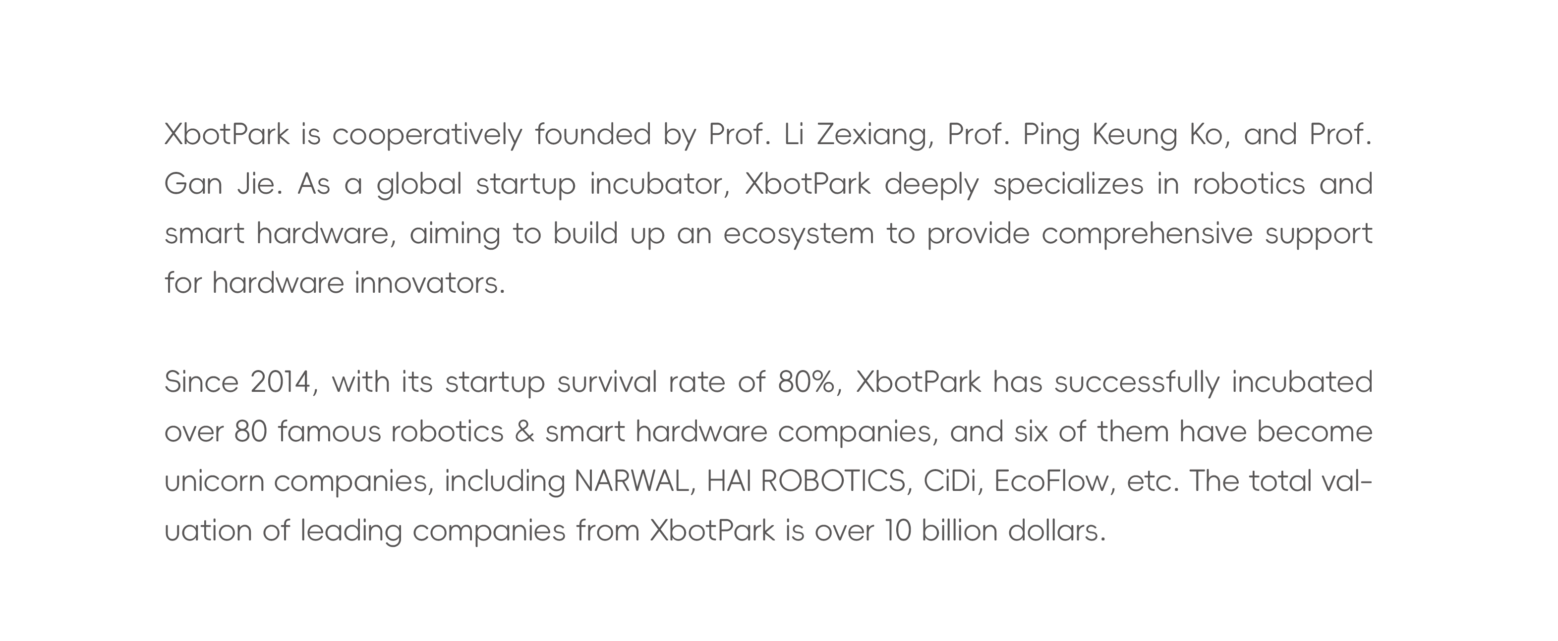 So far, more than 80 companies have emerged at XbotPark, with a staggeringly high success rate of over 80 percent. The total valuation of leading startups is now over 10 billion dollars. Among them, six startups have grown into unicorns... Here are the perks of XbotPark: